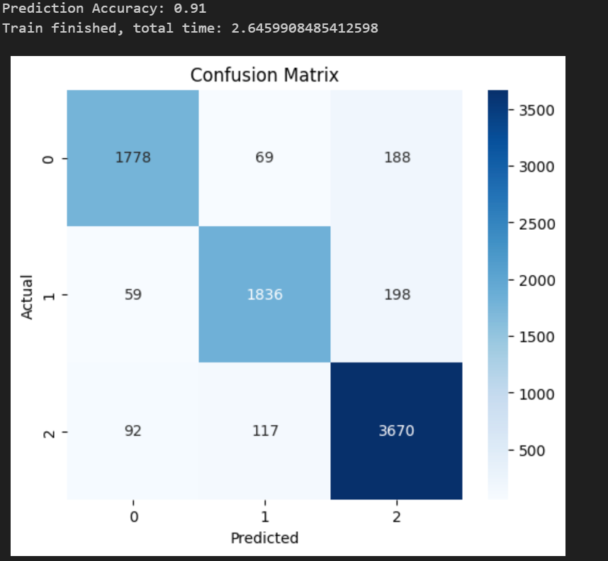 训练的准确度为0.91,验证了模型的可用性,并且训练的时间为2.64,作为基准将和后面的进行对比。